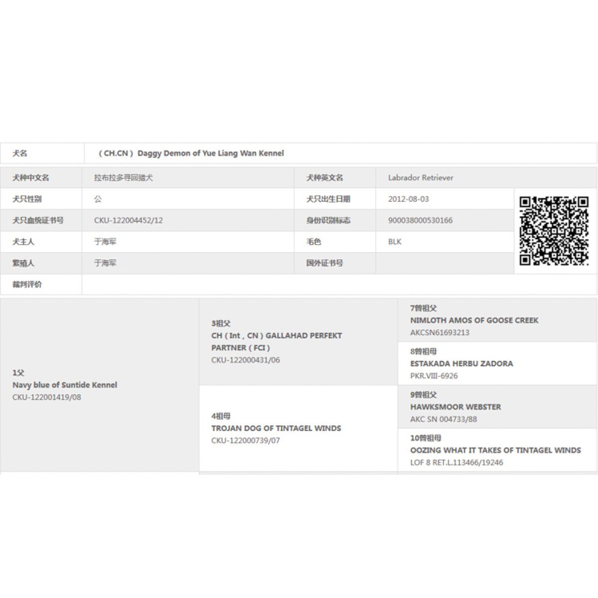 芯片号 900250000537867; 血统证书 cku-122011848/15